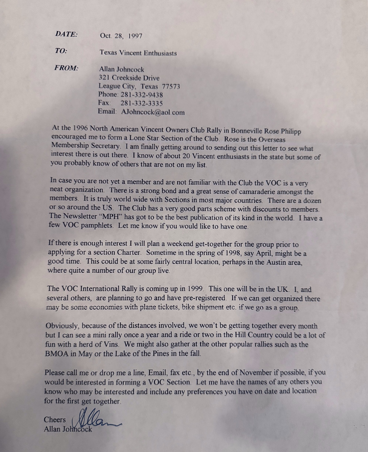 In late 1997 Allan sent out a letter to Vincent owners and enthusiasts, asking who would be interested in forming a Texas section of the Vincent Owners Club. Probably this was sent to members of the British Motorcycle Owners Club of Houston Texas, in which Allan was active, and others known to own a Vincent. He mentions that Rose Phillip (Overseas Membership Secretary) first suggested, at a North American rally, that Allan try to form a new section in Texas; she also provided a list of local VOC members.